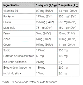 e da inflamação e a eficiência do metabolismo. A estes minerais, adicionamos extrato de rosa centifólia e de urtiga que além de antioxidantes têm propriedades drenantes.